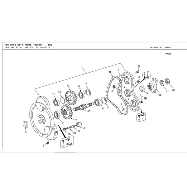 | 000 001 15252682 PTO ASSEMBLY 001 001 09060235 .HOUSING ASSY-MACHD 002 002 00784079 ..PIN 003 002 00454864 ..BOLT 004 002 00103320 ..LOCKWASHER 005 001 09004541 .SEAL 006 004 00444637 .PLUG (0.75IN) 007 017 00179826 .BOLT 008 017 00103320 .LOCKWASHER 009 001 09004540 .SEAL 010 002 00954528 .BEARING 011 002 00907696 .BEARING 012 001 09274893 .GEAR-DRIVEN 013 001 00444692 .PLUG 014 001 09195847 .GEAR-DRIVE 015 001 15252439 .SHAFT-DRIVE PTO 016 001 00144218 .BUSHING 017 002 09414895 .RING-SNAP 018 001 09195842 .GASKET 019 001 00187396 .COUPLING 020 001 15247042 .BREATHER ASSY 021 001 06750967 .CAP-BREATHER 022 001 00444698 .PLUG 023 006 00179860 BOLT 024 010 00103328 LOCKWASHER 025 004 00433142 BOLT 026 001 15300856 YOKE-PTO 027 001 09071870 WASHER 028 001 09269703 NUT |